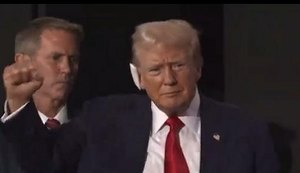 Trump faz primeira aparição pública e mostra curativo depois de atentado